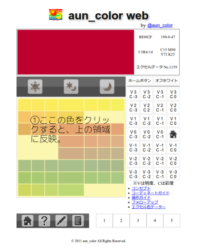 ①の領域のボタンを押すと、上の領域に色と情報が表示されます。