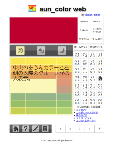②の太陽のボタンを押すと、中央のあうんカラーと左側の太陽のグループが拡大表示されます。